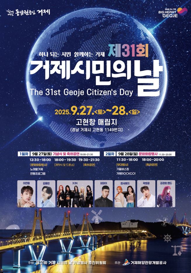 ·행사일시 : 2025.9.27.(토) - 9.28.(일) ·행사장소 : 경남 거제시 고현동 1149번지) ·행사내용 9/27 기념식 및 축하공연 18:00~21:30 12:30 ~ 18:00 문합화합행사 18:00 ~ 19:30 개막식 및 드론쇼 19:30 ~ 21:30 축하공연 9/28 문화화합행사 11:30 ~ 20:00 11:30 ~ 18:00 무대행사 18:00 ~ 20:00 축하공연 |